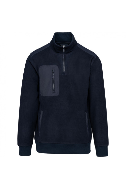 100% polyester recyclé post-consumer. Coupe droite. 2 poches zippées passepoilées en taslan devant avec tire-zip. 1 poche poitrine arrondie zippée avec tire-zip côté droit au porté en taslan avec surpiqûres ton sur ton. Col doublé avec côte 2 x 2 et zip en plastique recyclé + lien d'accrochage intérieur col. Empiècements de renfort épaules et avant bras en taslan. Bord-côtes tubulaire en rib 2 x 2 aux bas de manches et de vêtement. Etiquette de marque détachable.