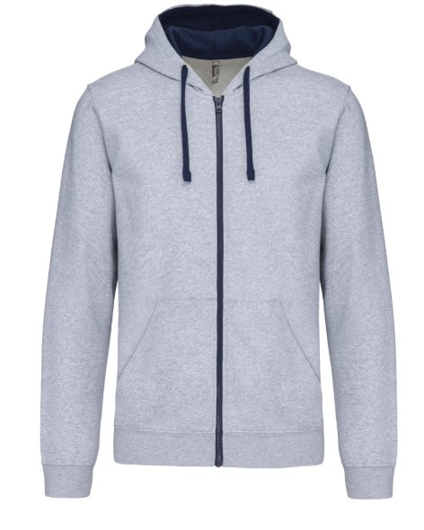 80 % coton / 20 % polyester. Coton peigné. Molleton brossé. Prises casque dans la poche kangourou et à l'encolure. Poignets et ourlet côtelés. Capuche doublée contrastante avec cordon de serrage. Fermeture éclair contrastée.
