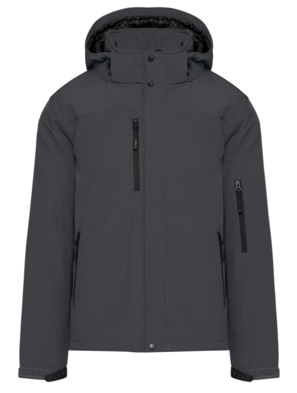 95% polyester / 5% élasthanne. Tissu contrecollé 3 couches respirant 3000 g/m² /24h et imperméable 8000 mm. Extérieur : 95% polyester / 5% élasthanne. Intermédiaire : membrane respirante. Couche intérieure : micropolaire. Doublure matelassée 100% polyester. Devant : 4 poches zippées (2 latérales, 1 sur la manche, 1 poitrine côté droit). 2 poches intérieures avec bouton pression. Capuche amovible 3 panneaux doublée et matelassée, réglable avec stoppeurs. Bas de manche réglable avec bande auto-agrippante. 1 zip côté cœur et 1 zip au bas du vêtement pour accès personnalisation.