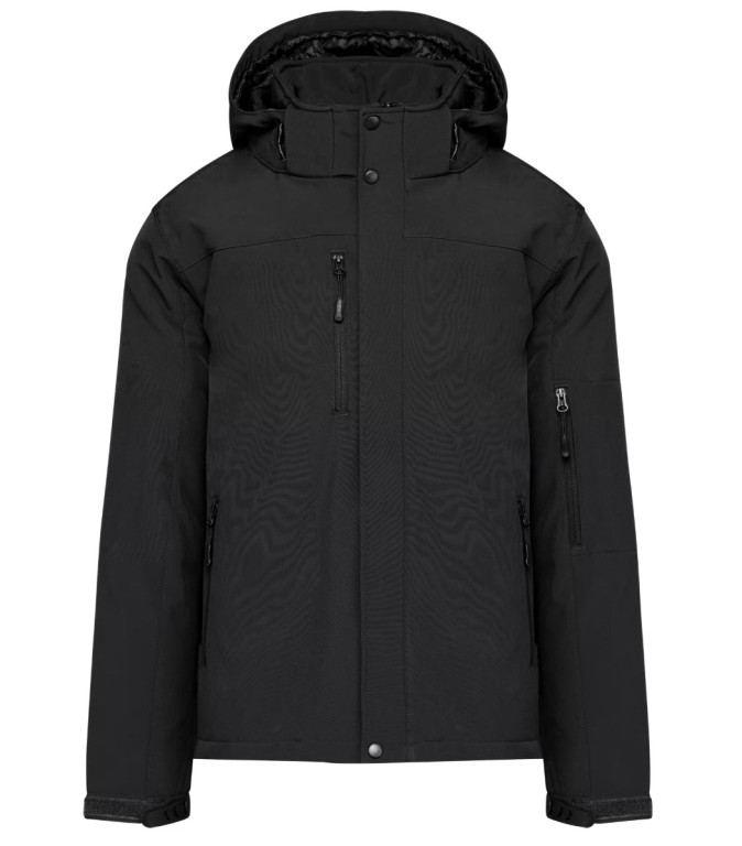 95% polyester / 5% élasthanne. Tissu contrecollé 3 couches respirant 3000 g/m² /24h et imperméable 8000 mm. Extérieur : 95% polyester / 5% élasthanne. Intermédiaire : membrane respirante. Couche intérieure : micropolaire. Doublure matelassée 100% polyester. Devant : 4 poches zippées (2 latérales, 1 sur la manche, 1 poitrine côté droit). 2 poches intérieures avec bouton pression. Capuche amovible 3 panneaux doublée et matelassée, réglable avec stoppeurs. Bas de manche réglable avec bande auto-agrippante. 1 zip côté cœur et 1 zip au bas du vêtement pour accès personnalisation.
