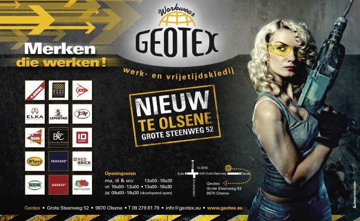 De Geotex Store is verhuisd van de Gentseweg 757 te Sint-Eloois-Vijve (Waregem) naar de Grote Steenweg 52 te Olsene (Zulte). Een ruimere winkel en parking!